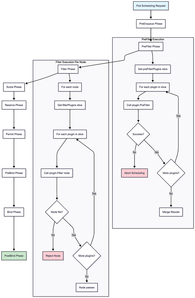 What I found particularly remarkable is that even basic operations like node filtering, resource checking, and pod binding are implemented as plugins. There’s no “core scheduling logic” that can’t be replaced.