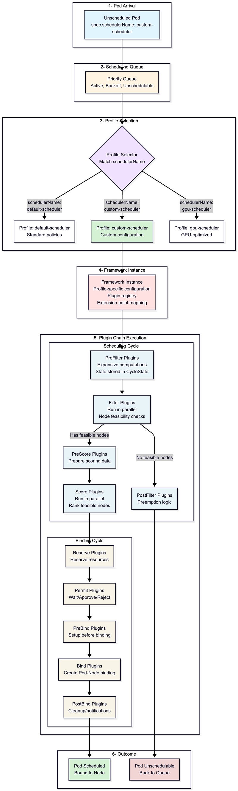 The flow shows the six stages every pod goes through during scheduling. Notice step 3 (Profile Selection) and step 5 (Plugin Chain Execution), these are your extension points. You can customize which profile a pod uses, configure the plugins within that profile, or write entirely new plugins that execute at specific points in the chain.
