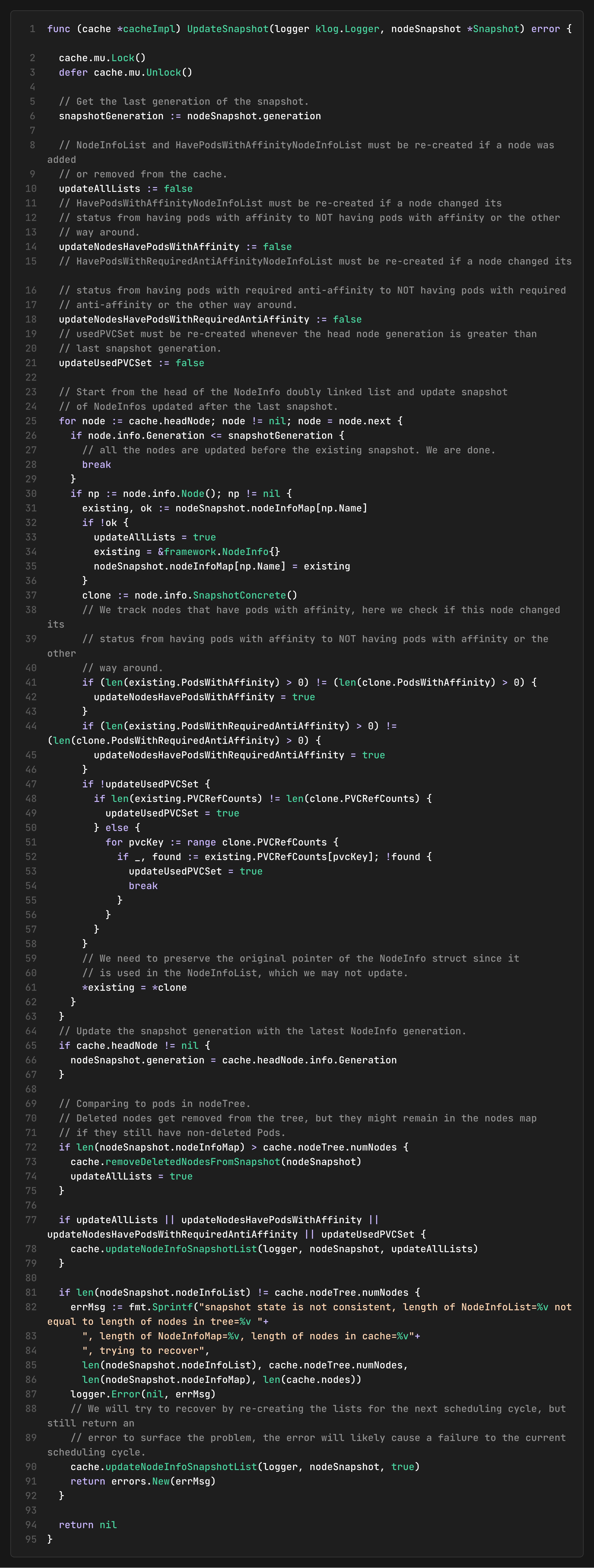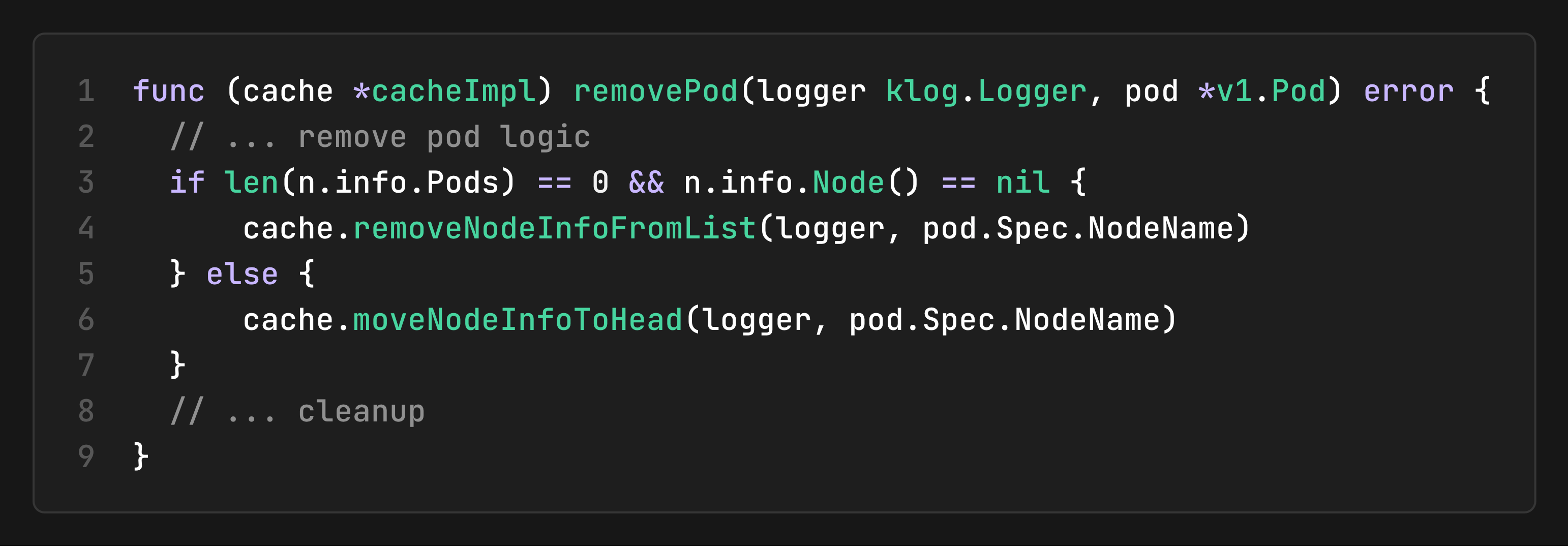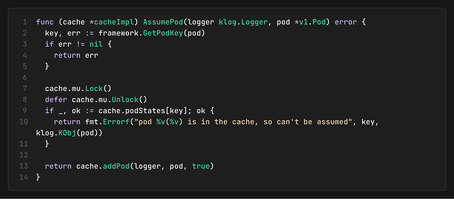 When the API server confirms a pod (via Add event), the cache transitions it from “assumed” to “added” state. This transition ensures consistency between the scheduler’s view and the actual cluster state. Code can be found here.