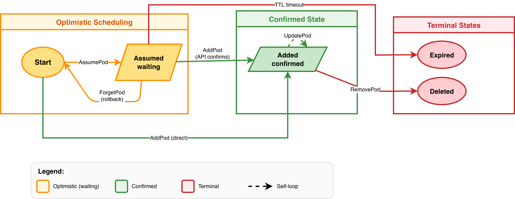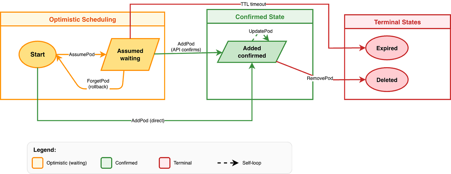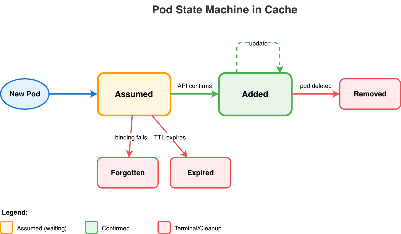 This state machine is crucial for understanding how the scheduler handles the gap between making a scheduling decision and that decision being confirmed by the API server. The “assumed” state allows the scheduler to optimistically update its view of cluster resources while waiting for confirmation.
