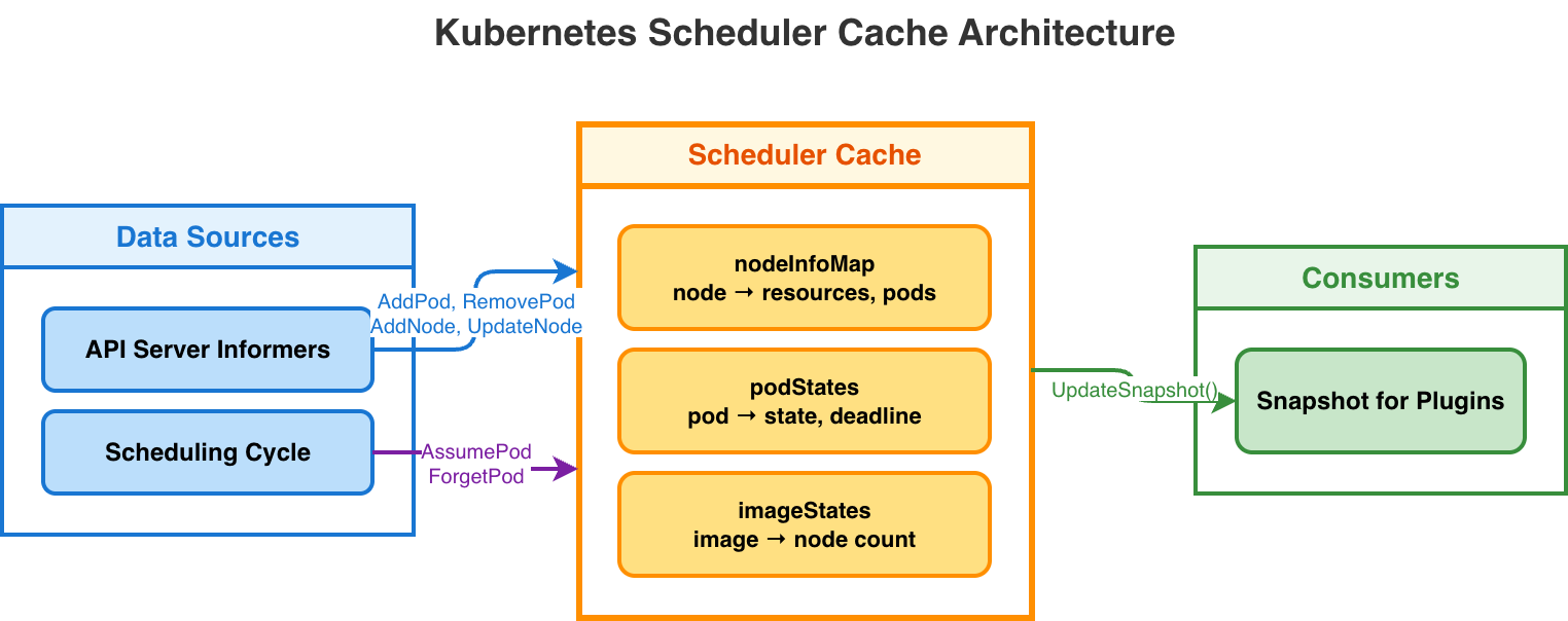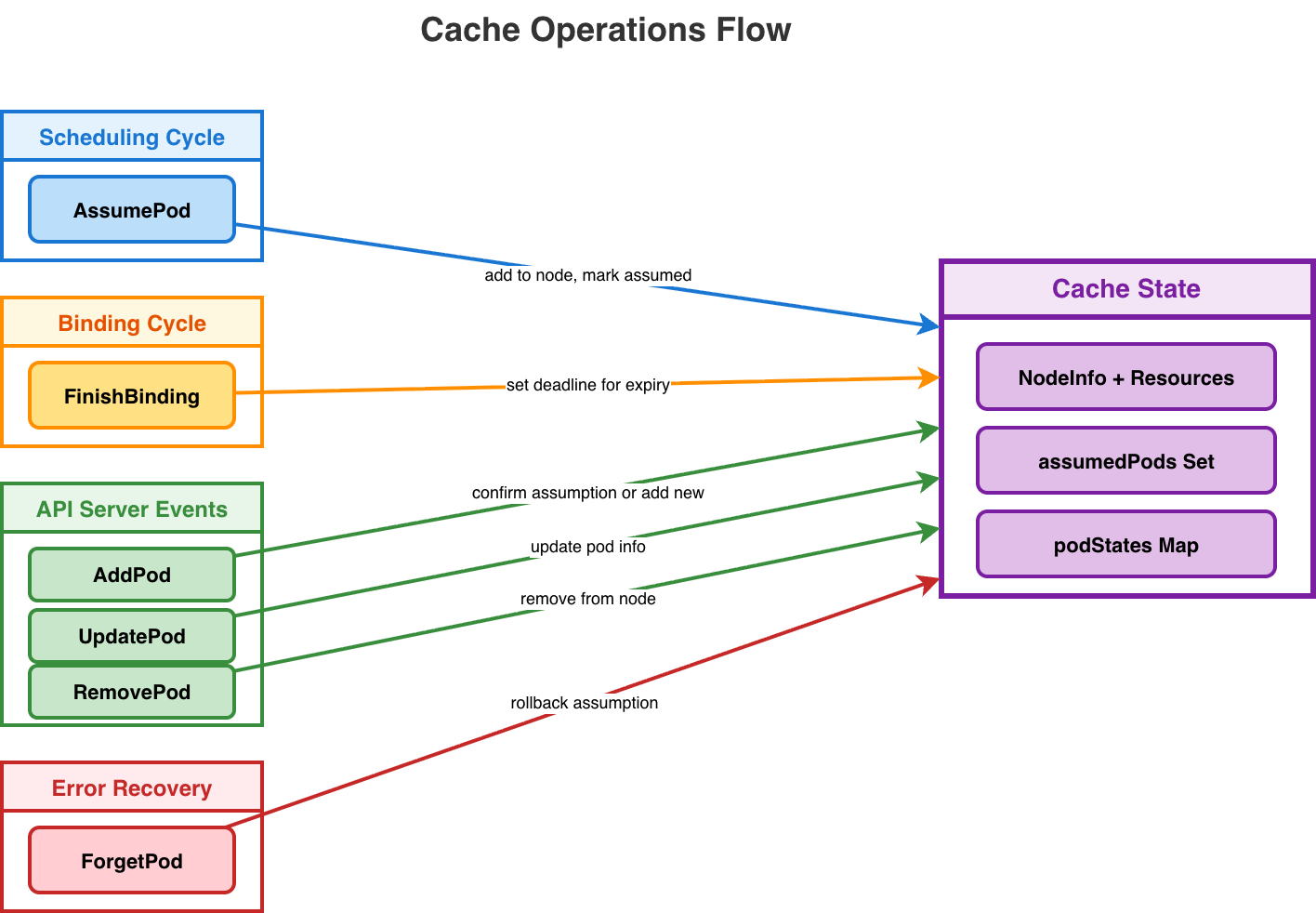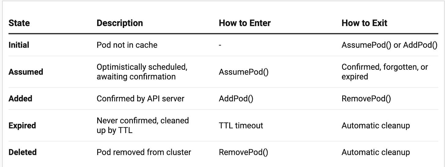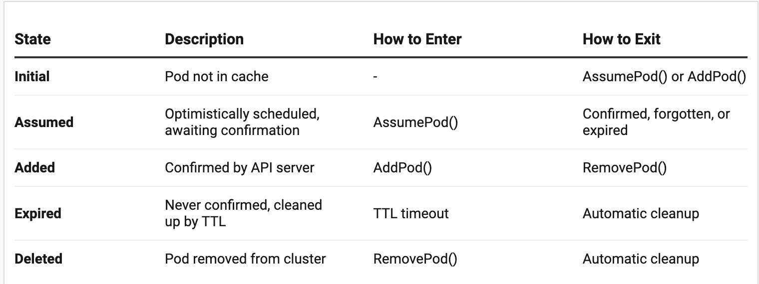 This state machine is crucial for understanding how the scheduler handles the gap between making a scheduling decision and that decision being confirmed by the API server. The “assumed” state allows the scheduler to optimistically update its view of cluster resources while waiting for confirmation.