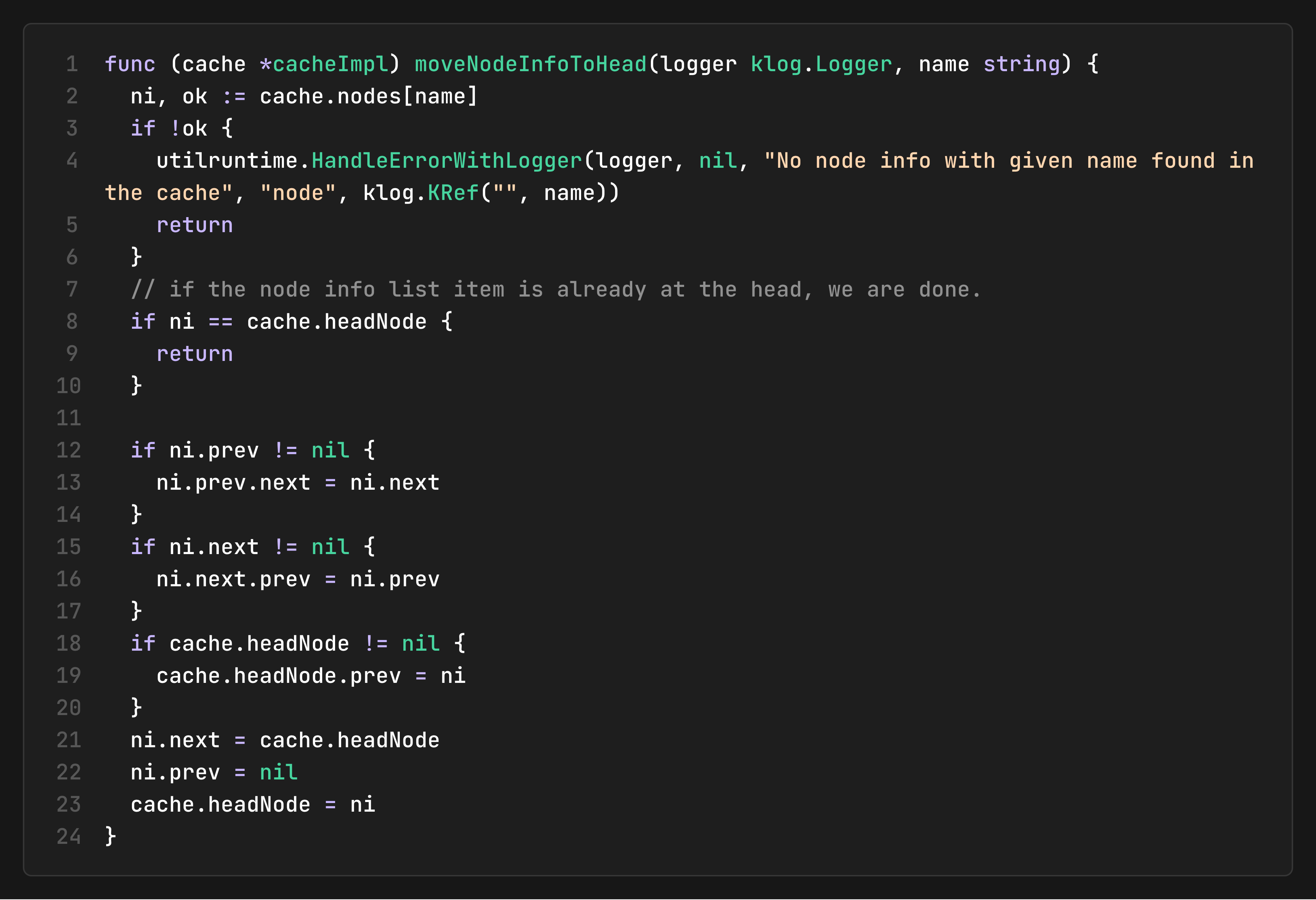 The cache uses a doubly-linked list to maintain node information in LRU order, ensuring that frequently accessed nodes are at the head of the list and improving cache locality and snapshot generation performance:
