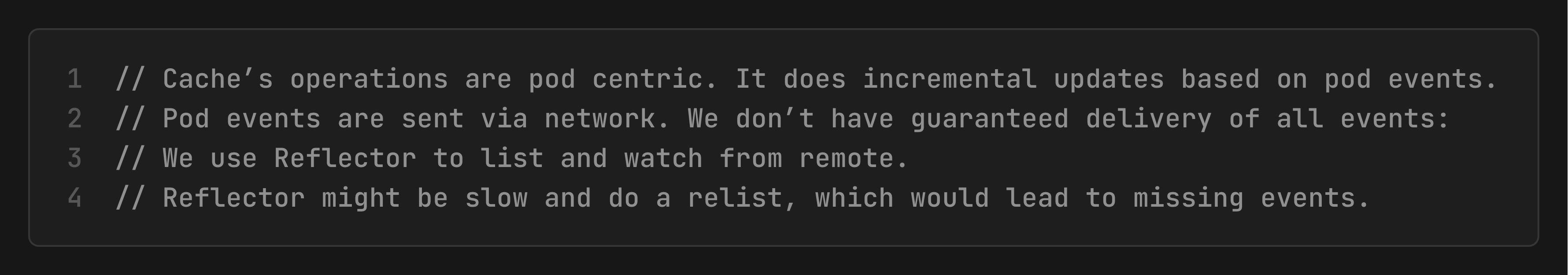The scheduler receives pod and node events over the network via Kubernetes informers, which introduces several challenges: