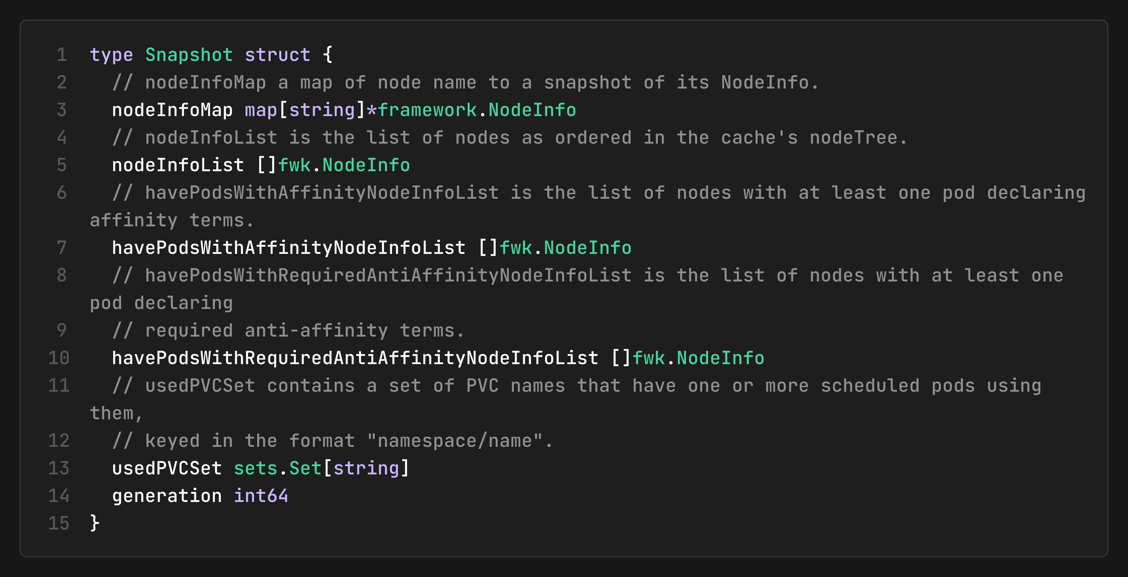 Snapshot: A consistent view of the cluster state used for each scheduling attempt, ensuring all plugins see the same cluster state.