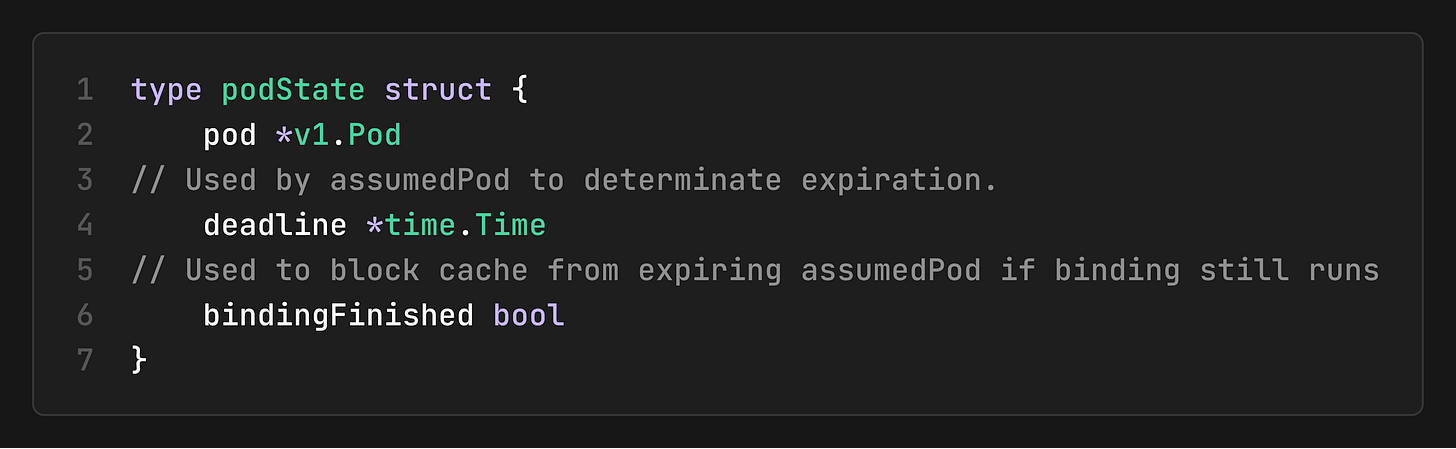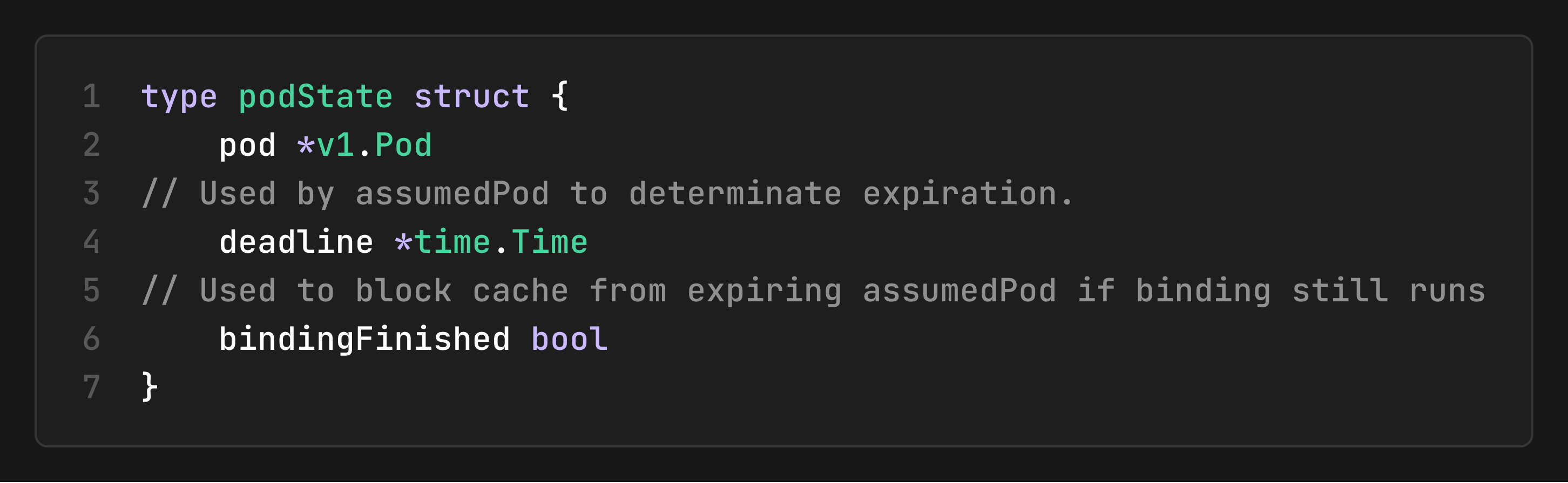 The `podState` structure tracks three pieces of information to enable the cache to handle the lifecycle of pods as they move through the scheduling process: