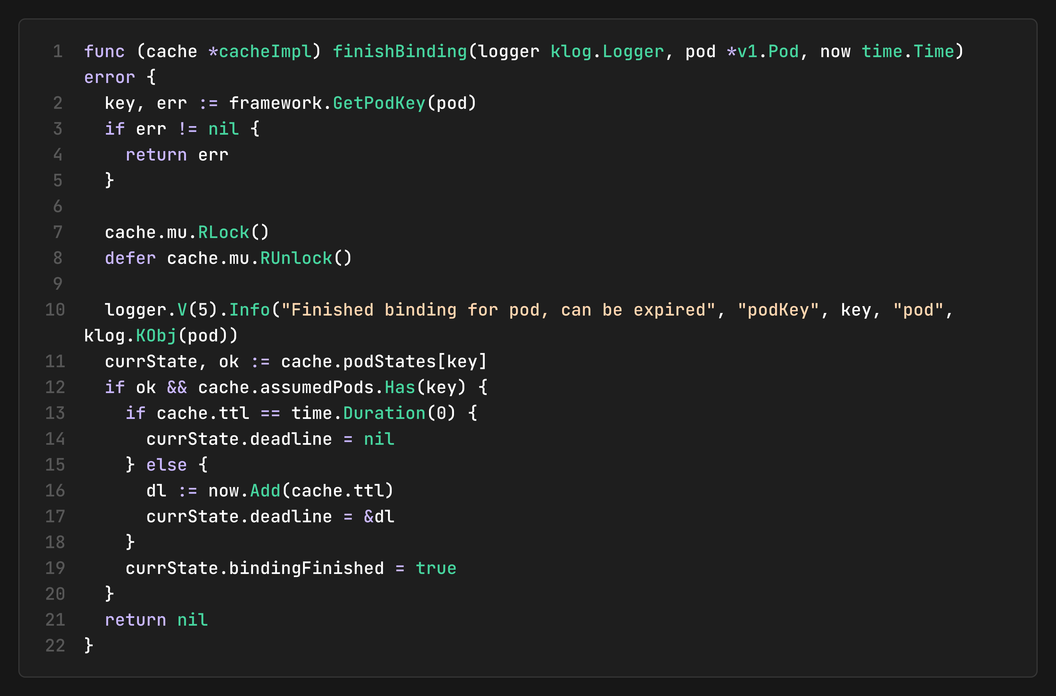 When the binding phase completes, the cache sets a deadline for the assumed pod. If the API server doesn’t confirm the pod within this deadline, it will expire and be removed from the cache. Code can be found here.