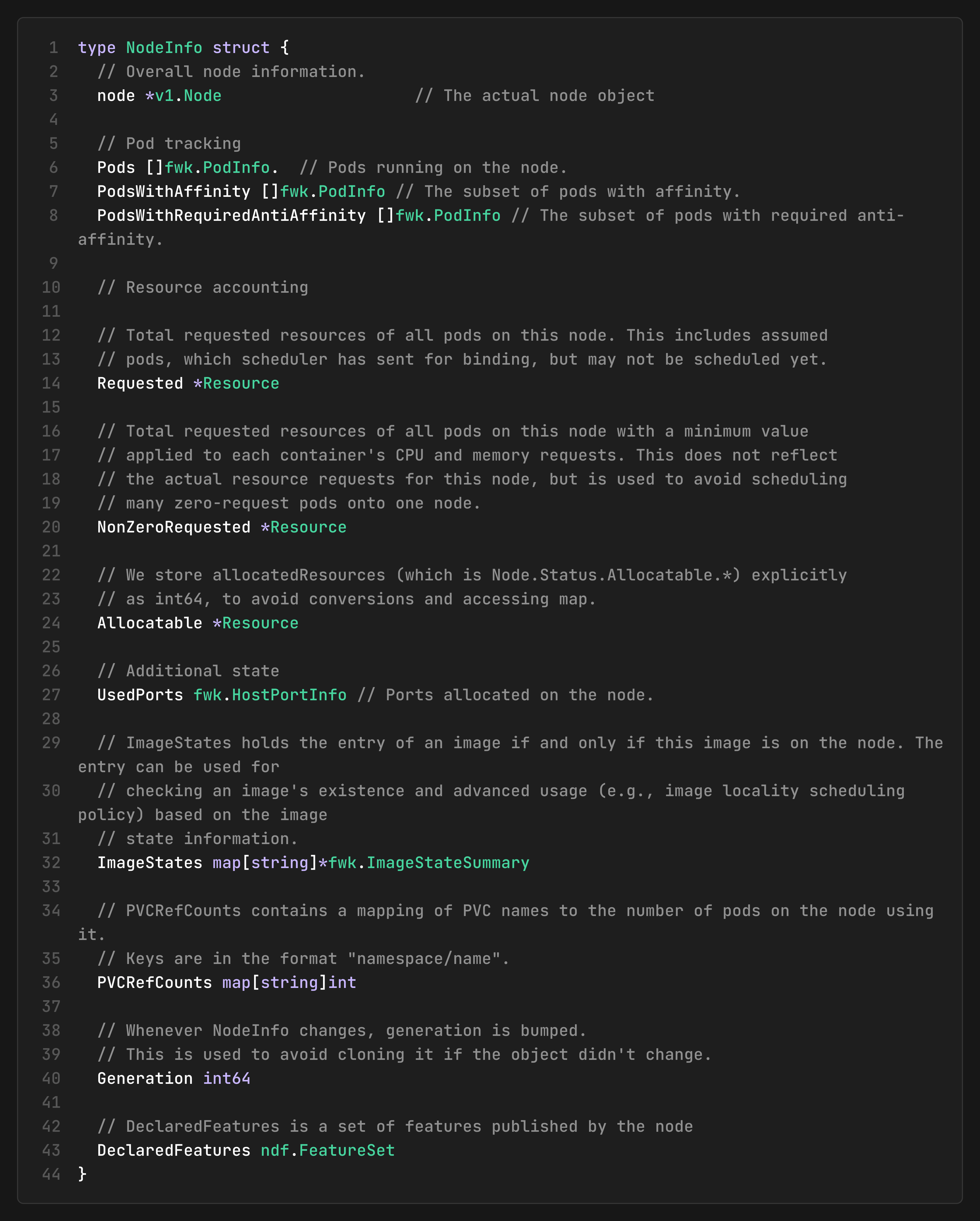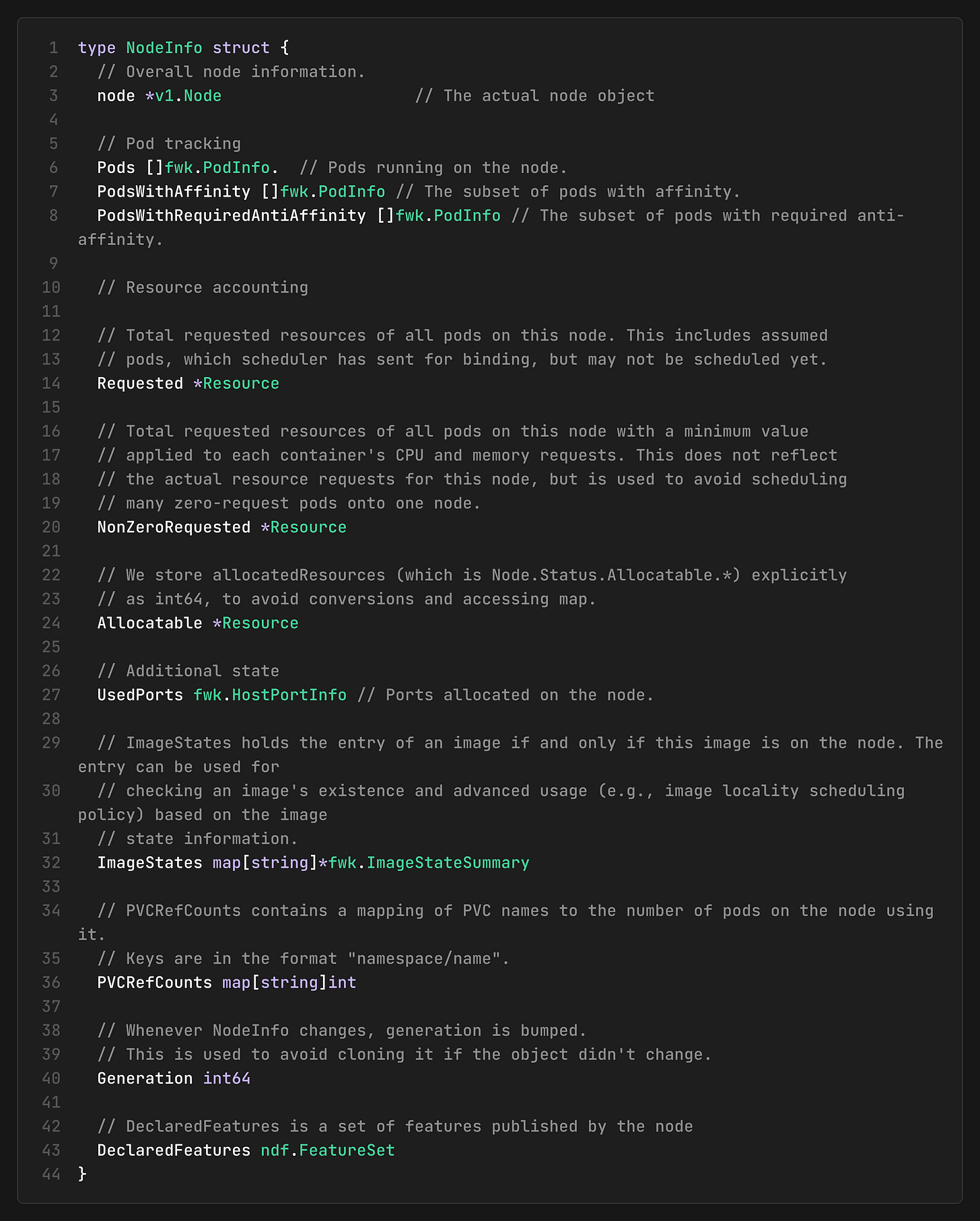 Each `NodeInfo` contains all information that the plugin may need to make scheduling decisions: